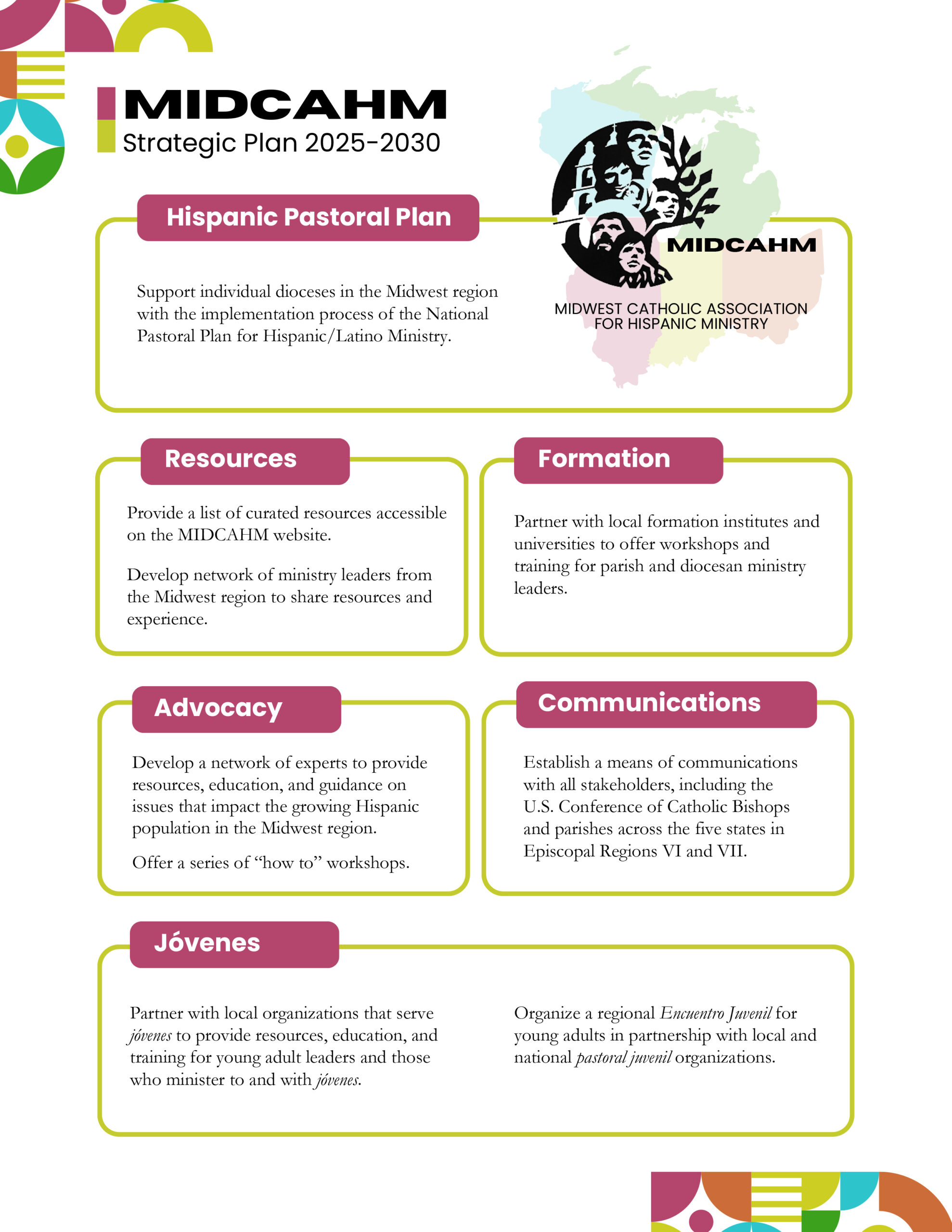 The members of the Midwest Catholic Association for Hispanic Ministry in communion with the Catholic Bishops strive to live and model by means of Pastoral de Conjunto, a ministry that responds to the present and future needs of Hispanics in the Midwest region, taking into consideration their faith, culture, and contributions to the Catholic Church and society.